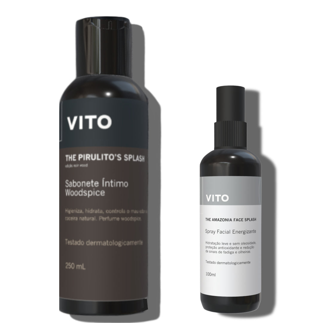 Kit que contém 1 unidade do mais novo Sabonete Íntimo Masculino Vito The Pirulito's Splash Woodspice e 1 Spray Facial Amazônia Face Splash. Recomendado para skincare e higiene adequada da região íntima.
